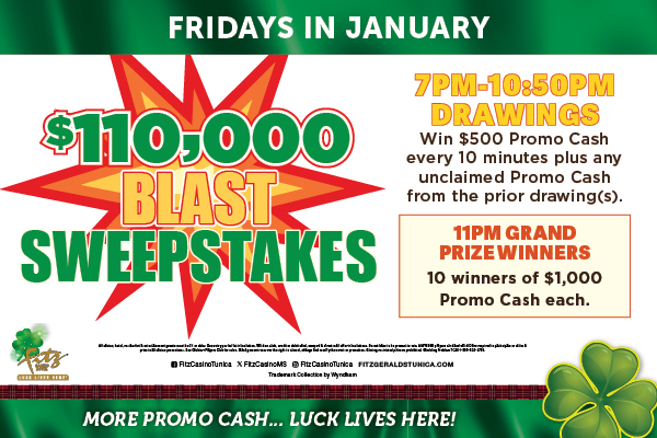 $500 Promo Cash every 10 minutes from 7pm-10:50pm and any unclaimed Promo Cash from prior drawing(s).