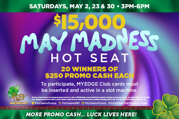 It's the "$15,000 MAY MADNESS HOT SEAT" - We are calling all Card Members - You must be actively playing at a slot machine using your MYEDE Players' Card to be eligible to win. 20 Lucky Winners will win $250 Promo Cash each between 3pm-6pm.