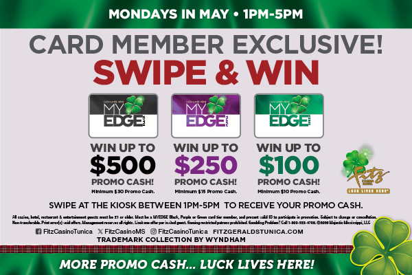 Calling all Black, Purple, & Green Card Members - Come Swipe your card Mondays in May. Win up to $500, $250, or $100 Promo Cash respectively.