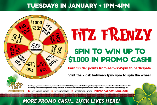 Spin to win up to $1,000 in Promo Cash! Earn 50 tier points from 12:01am-3:30pm to participate.