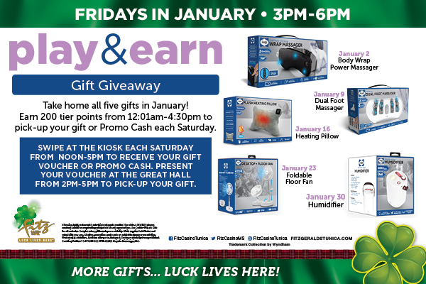 Play and earn 200 tier points to pick up your gift OR Promo Cash in January.